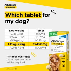 For dogs between 11-22kg in bodyweight use 1 Advantage Chewable tablet