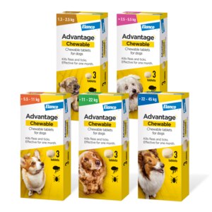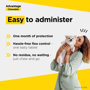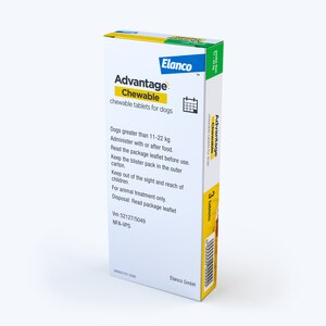 The convenient monthly administration and beef flavour make Advantage Chewable easy to give, even to picky eaters due to its palatable formulation. Simply offer the chewable tablet to your dog with or shortly after a meal.