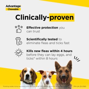 Advantage Chewable offers a simple and effective way to protect your dog from fleas and ticks. This innovative chewable tablet, starts working quickly, eliminating new fleas in 4 hours and existing fleas in as little as 6 hours and ticks within 8 hours of administration2. Its persistent activity provides continuous protection for a full month, giving you peace of mind knowing your dog is protected from these troublesome parasites.