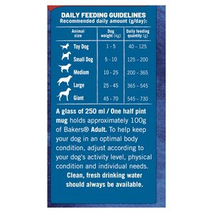 A glass of 250 ml / One half pint mug holds approximately 100g of Bakers® Adult. To help keep your dog in an optimal body condition, adjust according to your dog's activity level, physical condition and individual needs.