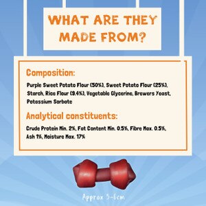 My dog loves these vegetable based knots They are a good durable chew that keeps him busy for a while The purple color is fun and they are great for his digestion