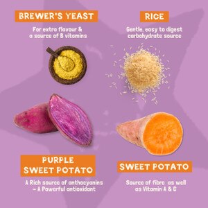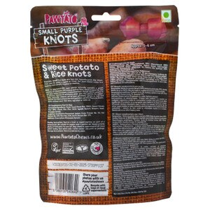 Benevo Small Purple Pawtato Knots are a low fat dog chew made from 75% sweet potato! A blend of non-GM purple and orange sweet potato and rice. Naturally gluten-free and soya-free. No added sugar, salt, artificial colours or flavours. Multi-language packaging (EN, DE, FR, IT, ES). Vegetarian Society UK and Vegan Society UK approved product. PETA approved brand.