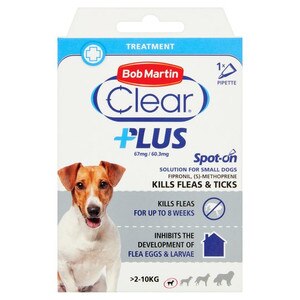 Bob Martin Clear Plus Spot on Flea & Tick treatment is a solution for Small Dogs (2 -10 kg) over 8 weeks old, containing Fipronil and (S)-methoprene that kills fleas & ticks and inhibits the development of flea eggs, larvae and pupae after application, preventing the re-infestation of dog´s home environment.