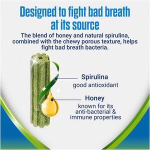 Instead of simply masking bad breath, Purina® Dentalife® ActivFresh®, containing natural spirulina and honey, is designed to help neutralize the bacteria responsible for bad breath. ActivFresh® has the Dentalife® shape, size, and chewy, porous texture that is scientifically proven to reduce tartar build-up.