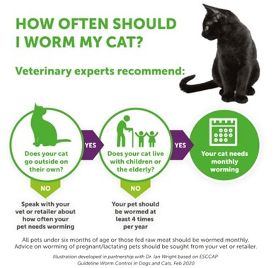Research shows most UK cats should be wormed monthly, depending on lifestyle factors such as hunting, scavenging, and outdoor access.* Some cats may require less frequent treatment; speak to your vet for personalised guidance.