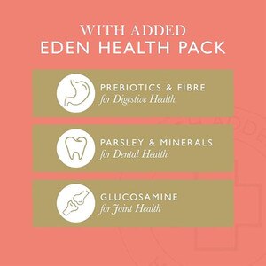 Salmon (44%), Mixed Game Meat (Inc: Buffalo, Bison, Wild Boar) (26%), Vegetable Glycerine, Sweet Potato, Eden Health Pack (Cellulose, dried parsley, sodium hexametaphosphate), yeasts (a source of mannanoligosaccharides; prebiotic MOS), chicory inulin, glucosamine (5.6%), A blend of organic acids and minerals.