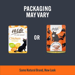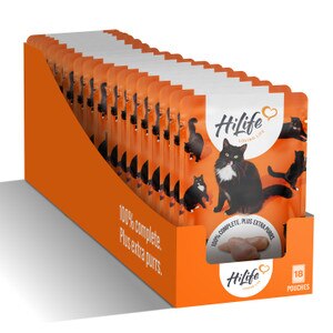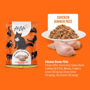 Prepared using only 100% Natural Ingredients, HiLife it's only natural, is made with 50% meat and is free from grains, soya, gmo's and artificial additives. A complete petfood for adult cats.