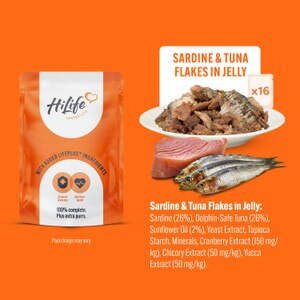 Sardine & Tuna Flakes in Jelly: Sardine (26%), Dolphin-Safe Tuna (26%), Sunflower Oil (2%), Yeast Extract, Tapioca Starch, Minerals, Cranberry Extract (150 mg/kg), Chicory Extract (50 mg/kg), Yucca Extract (50 mg/kg).