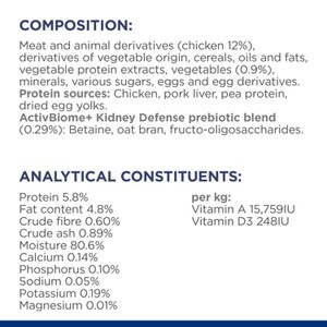 Hill's PRESCRIPTION DIET k/d cat food is clinical nutrition to help protect your cat's vital kidney function. Formulated with ActivBiome+ Kidney Defense, a proprietary blend of prebiotics shown to nourish the gut microbiome to help support kidney function. This nutrition is clinically proven to improve & lengthen quality of life. This wet food is made with chicken & added vegetables and has a delicious taste that your cat will love.
