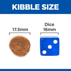 The larger kibble is much better for him to chew, which helps slow down his eating. It's a very nutritious food that keeps him satisfied.