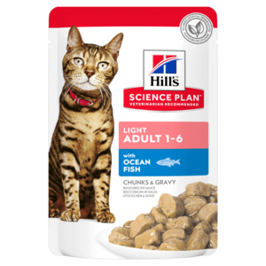Hill's™ Science Plan™ feline pouches Adult Light are specially formulated for adult cats who require fewer calories. This includes cats who are less active, neutered or are otherwise prone to weight gain.