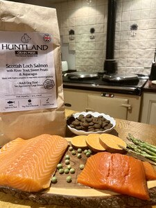 Huntland Adult Salmon Large Breed is a 100% natural and grain-free food specially balanced, like no other food on the market, by 50% meat and 50% vegetables, fruit and botanicals. Freshly prepared Scottish Salmon is the main ingredient in this recipe, with other lovely ingredients like river trout and asparagus, altogether making a delicious dinner for man's best friend. With reduced carbohydrate levels due to no nasty cereals or grains, Huntland dog food makes the perfect complete and balanced diet for all adult large breed dogs. Huntland foods have been created by the help of nutritionists and taste tested by employees' very own pets at home - Who absolutely loved it! Not only all of this but it is also extremely well priced!