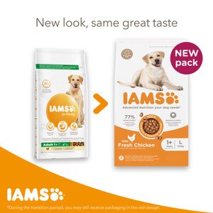 We have fed IAMS large breed chicken dog food to our Husky/Lurcher Cross (Bilbo Baggins) since he attained adulthood 8 years ago and he has thrived on it and we are regularly complimented by our vet on Bilbo's overall condition and good health. Last yearwe acquired a labrador pup (Sadie) and now that she has reached adulthood we feed her IAMS Adult too hence our last order for 4x12kg bags instead of the usual 2 bags. We intend to keep both dogs on this food which they enjoy and which clearly gives them excellent nutrtion.