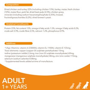 Dried chicken & turkey 24% (including chicken 14%), maize, maize grits, barley, animal fat, fresh chicken (4.7%), sorghum, dried beet pulp (2.7%), chicken gravy, minerals (including sodium hexametaphosphate (0.38%)), fructooligosaccharides (0.21%), brewer's dried yeast.
