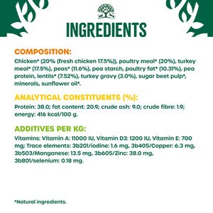 chicken* (20% (fresh chicken 17.5%)), poultry meal* (20%), turkey meal* (17.5%), peas* (11.6%), pea starch, poultry fat* (10.31%), pea protein, lentils* (7.52%), turkey gravy (3.0%), sugar beet pulp*, minerals, sunflower oil*. *Natural ingredients.