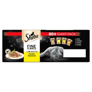 - Available in convenient 85g cat food pouches, Sheba Fine Flakes wet cat food with Poultry in jelly is gently prepared, with an exquisite flavour that cats love, time and again