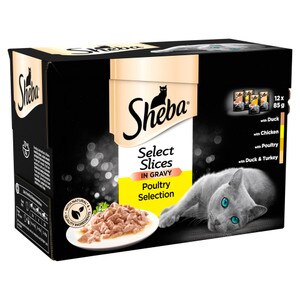 - Sheba Select Slices with Poultry in Gravy is a deluxe medley of tender cat food pieces in a delicious gravy